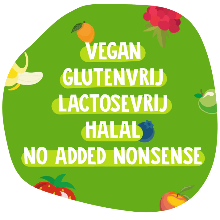 Fruit (geconcentreerd perensap, geconcentreerd appelpuree, geconcentreerd pruimpuree, geconcentreerd perenpuree, geconcentreerd aardbei puree, geconcentreerd framboospuree, geconcentreerd zwarte bes puree, antiklontermiddel: cellulosevezel, geleermiddel: pectine, natuurlijke aroma's, citroenzuur.