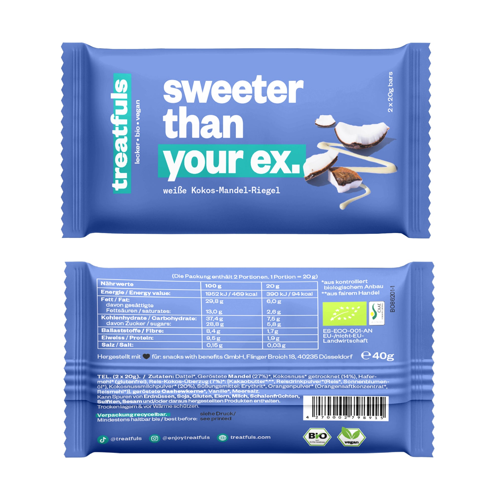 White vegan chocolate, no refined sugar, no additives and full of pleasure! That's exactly what's possible now, thanks to our Creamy Coco Kisses! Creamy sweet coconut flavor meets almond pieces with cashew butter and is kissed by melt-in-the-mouth white vegan chocolate.
